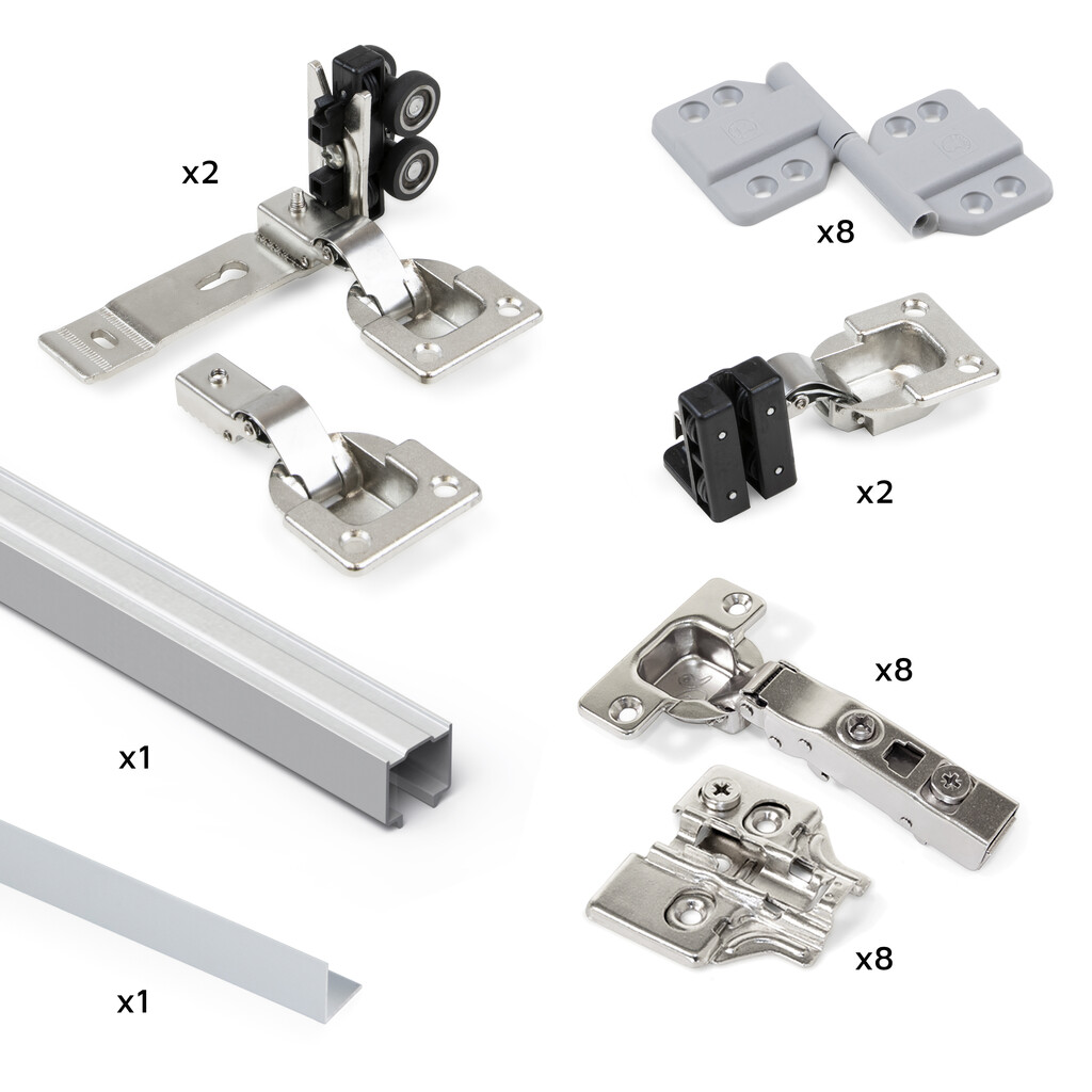 Includes: 2.35m upper rail, 2.35m lower rail, 2x upper guides, 2x lower guides, 8x centre hinges, 8x side hinges, 8x hinge plates and screws.