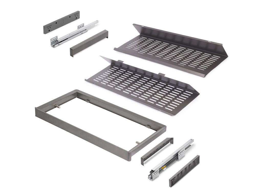 Pull-out shoe drawer Quartz with frame M90 L862–888mm, perforated base, SOFT, steel/titanium