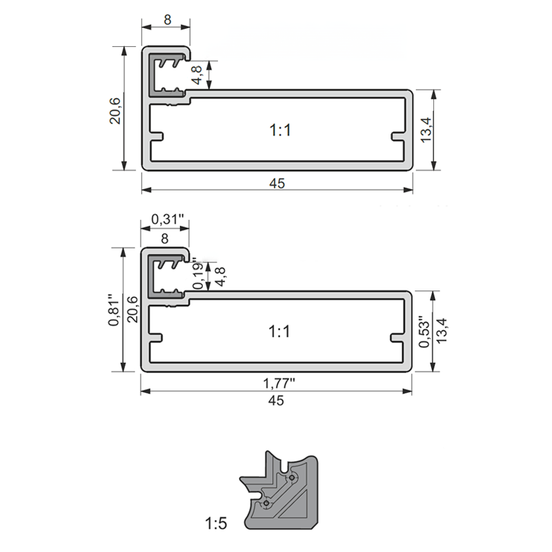 Alumiiniumprofiil KAPA 45×20,6 mm kapiuste valmistamiseks, (anodeering või pulbervärv)