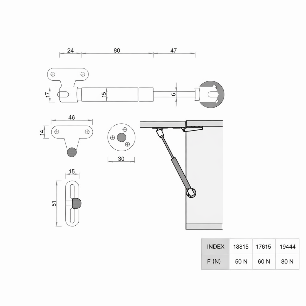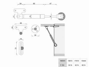 MG15- 80N gaasitõstuk mööbli esipaneelidele ja allalastavatele paneelidele reguleeritava avanemiskiirusega.