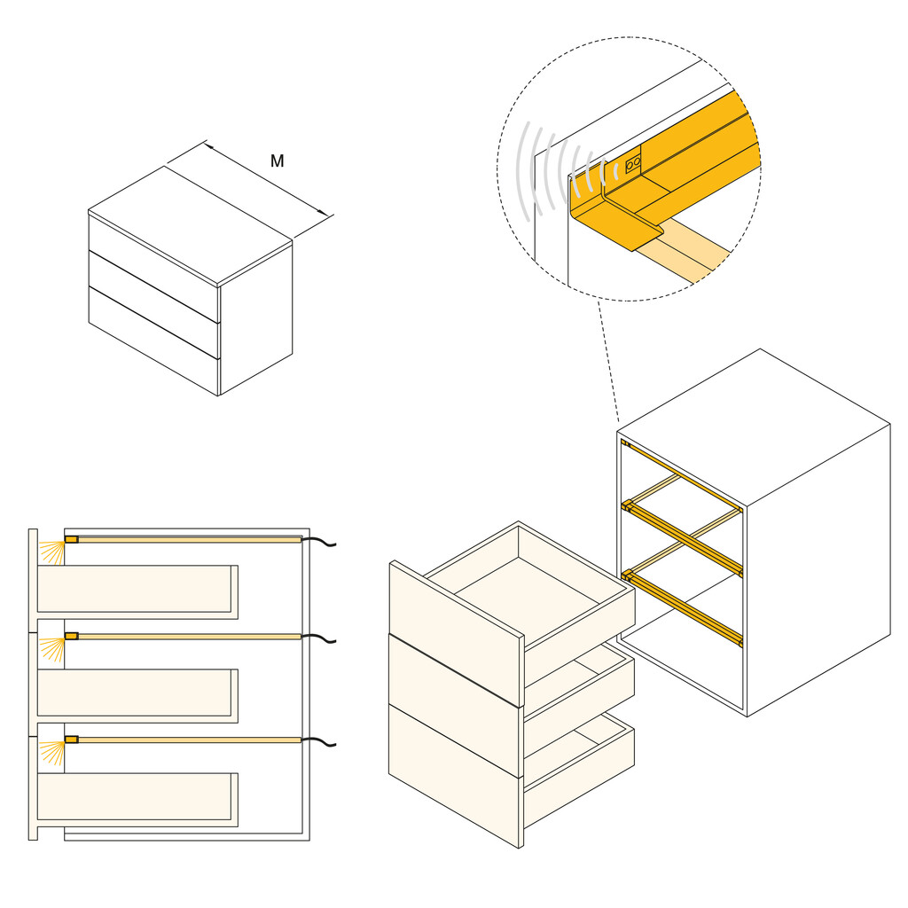 LED-valgusti TAIKA koos anduriga, mis lülitab valgusti sisse sahtli avamisel ja kustutab valguse sahtli sulgemisel.