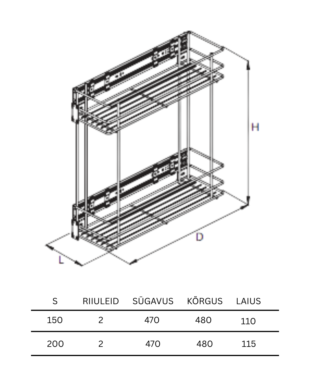 Väljatõmmatav cargo (pudelihoidja) 2-riiuliga M150mm, L110mm,H480mm, S470mm, SLOW, teras/valge