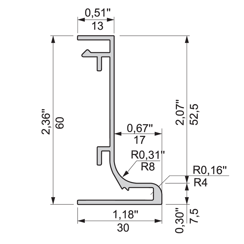 Käepideme profiil UMO-922 serva peale L3000mm 36 x 19,9mm, alumiinium/inox/harjatud roostevaba viim.