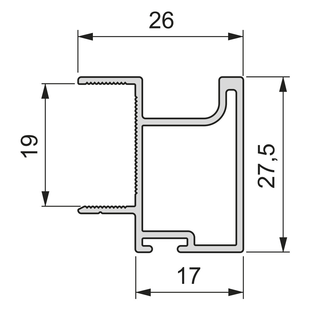 Liugukse küljeliist 19 mm,pikkus 2,35m,Placard 74 alumiinium/hall matt(PU8)