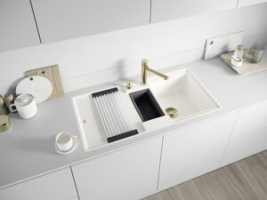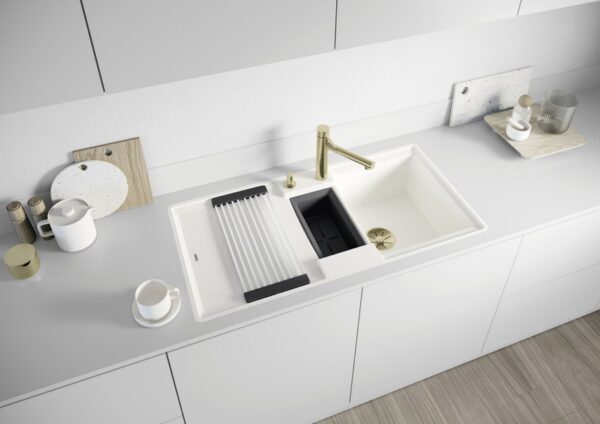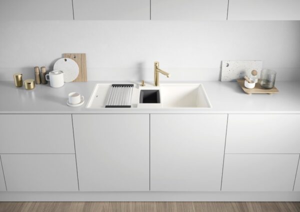 Mugav kasutada tänu XL-suurusele valamu kausile, mis on kombineeritud kahe praktilise äravoolu ja kuivatusalaga.