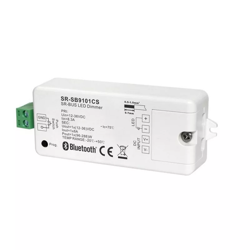 RF (raadio sageduse tehnoloogia) ja Bluetooth vastuvõtja SR-1009CS on 1-kanaliline 12-36V konstantse pingega LED-dimmer,