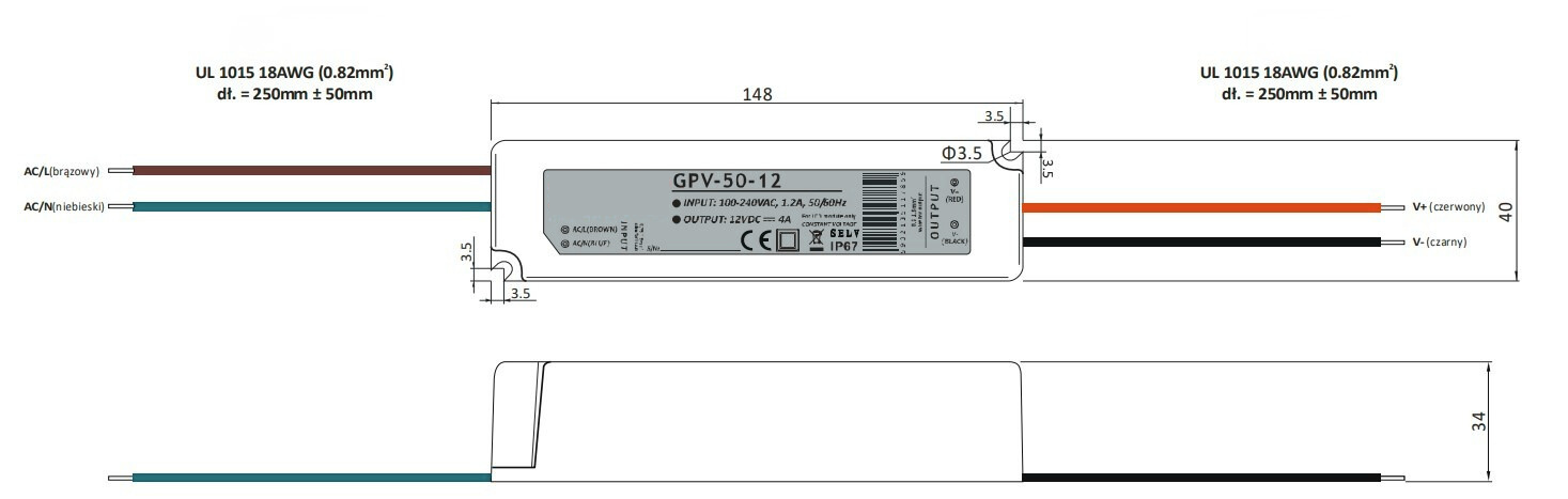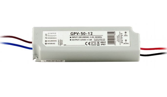 Toiteplokk 100-240VAC 50W 12VDC 4A IP67 145x55x35mm, hall