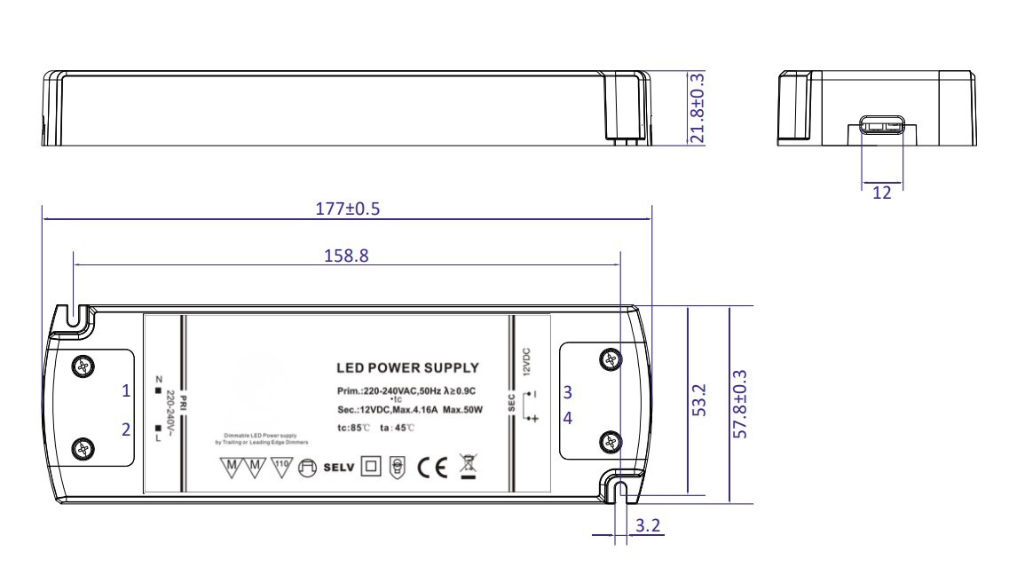 Toiteplokk DIM TRIAC 12V/4.17A CV 50W, ilma kaabliteta, 177×57.8×21.8mm, plastik/valge