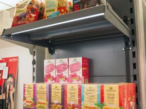 Toitesiin FLAT-TRACK valget värvi plastkorpusega, mõeldud riiulite professionaalseks ja esitlevaks valgustamiseks ilma nähtavate või segavate kaabliteta.