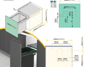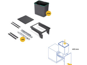 Eemaldatav, käsitsi väljatõmmatav prügikast külgkinnitusega kapimooduli sisse, majapidamisjäätmete sorteerimiseks ja eraldamiseks.
