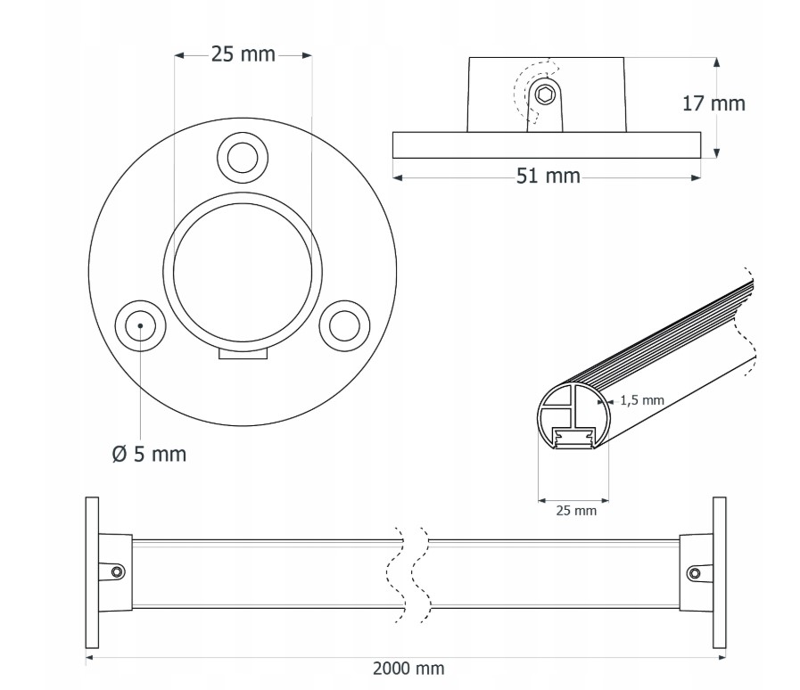 LED riidepuu toru Ø25 mm kahe PRO I (tugevdatud classic) seinakanduritega.