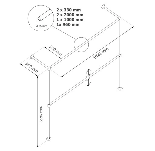 Ümar riidepuutoru PRO Ø25mm komplekt K203xL102 cm, teras/must matt