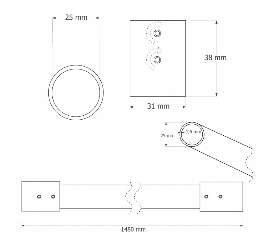 Ümar riidepuutoru SMART Ø25mm, L1480mm, 2 otsakandurit, teras/matt vask