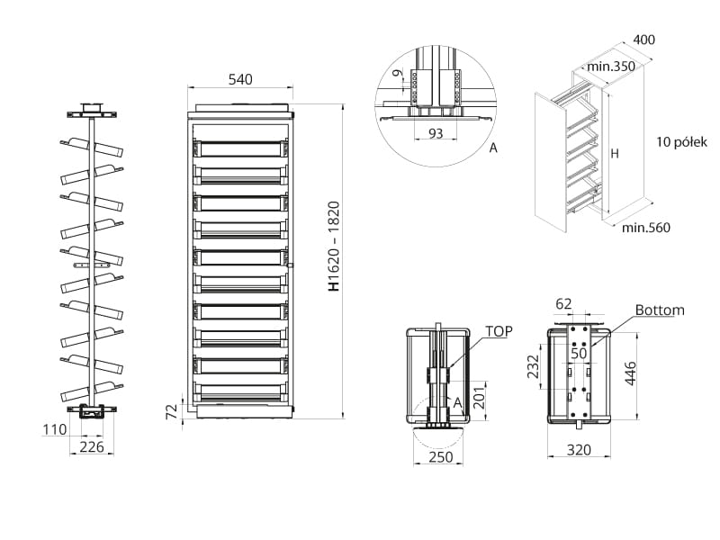 Väljatõmmatav jalatsiriiul SYMPHONY, H1620-1820mm, S542mm 10 riiuliga, teras/valge
