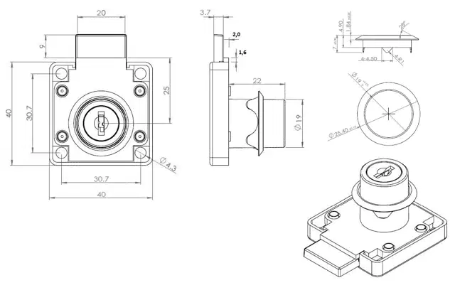 Furniture lock M-850 Ø19x22mm for drawer K/D (Key Differ) #J11 with CK 2-key and rosette, black