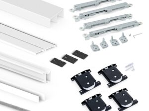 Lükandukse furnituuri komplekt Placard74 sisaldab kõiki tarvikuid ja juhtsiine kahele uksele palaldamiseks peale ukselehte .