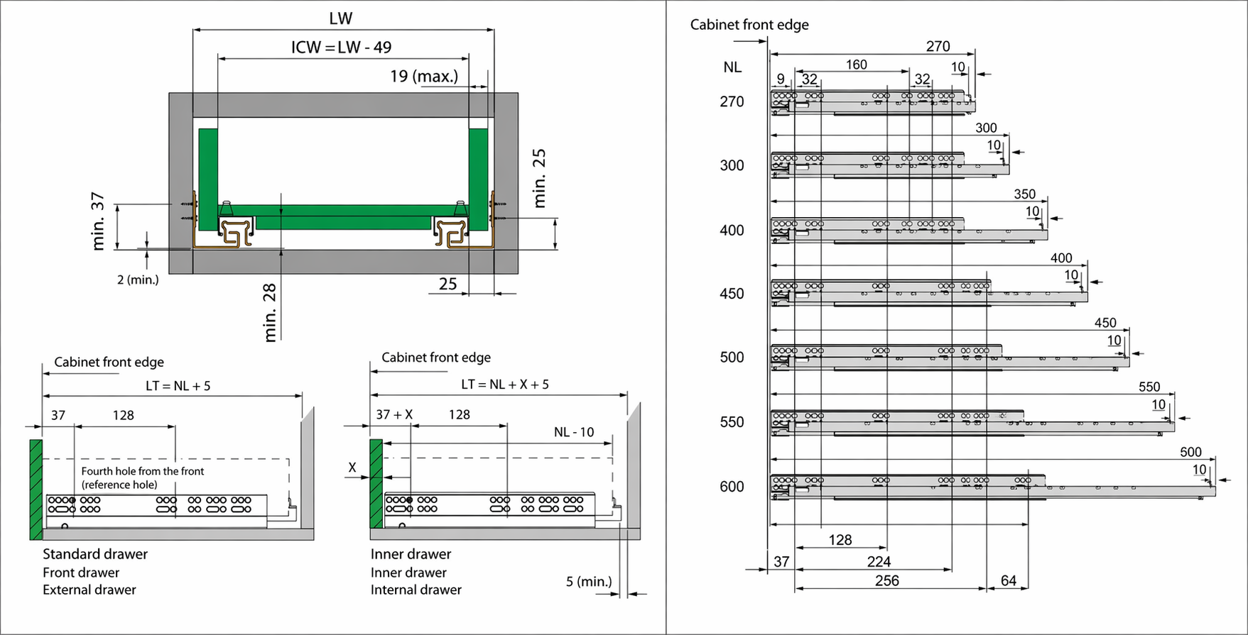 Premium 3D vaikselt sulguv sahtlisiin. Puuringu skeem ühtib Blumi Tandem siinide puuringuga. Vaadake palun paigaldusjoonist.