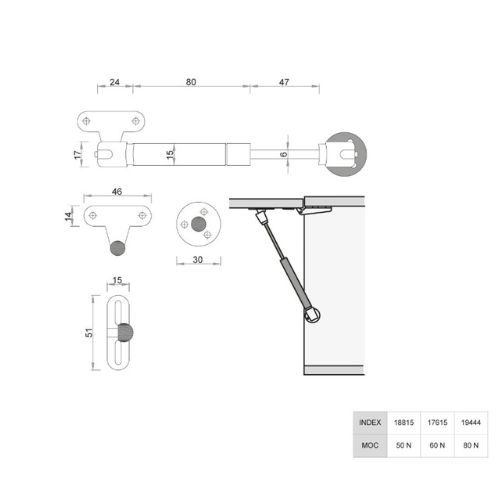 Gaasiamort MG15 ülesse avanevale uksele L180mm 80N, hall