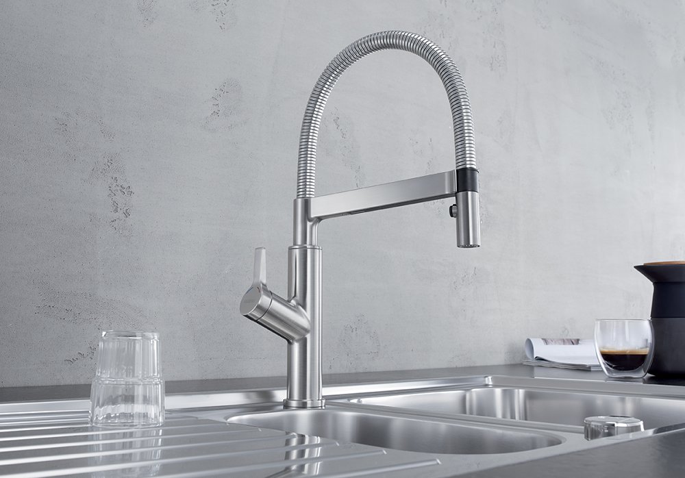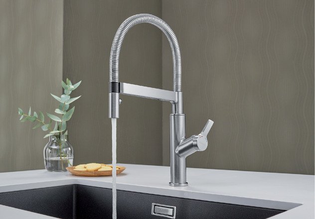 BLANCO SOLENTA-S on roostevabast terasest viimistlusega, vasakpoolse kangiga, integreeritud lülitiga kahejoa käsidušiga, integreeritud liikumisandurist sensoriga ja start-stop-funktsiooniga.