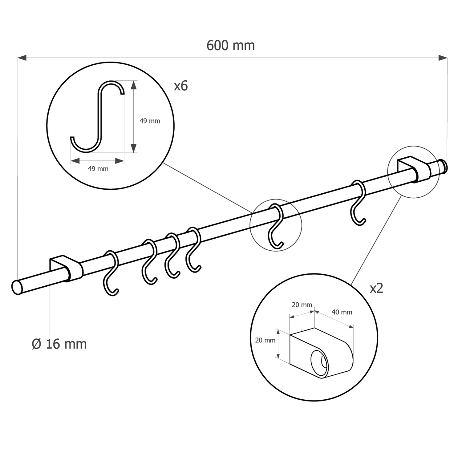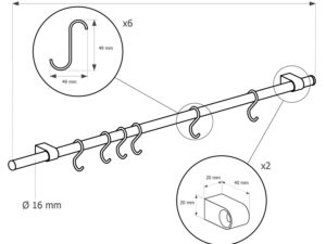Komplektis: seinareeling 600mm, 6 x konksud, 2 x seinakandurid, 2 x otsakorgid ja kinnituskruvid.