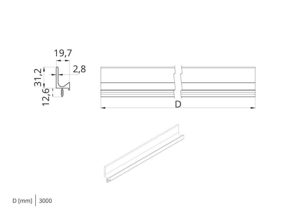 Käepide profiil UMO-930(L-kuju) L3000mm, 29,7mm(+9mm) x19,5mm, alumiinium/valge matt