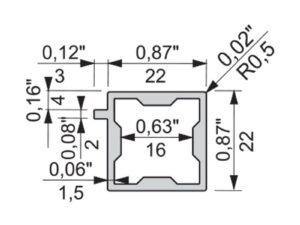 Konstruktsiooniprofiil ühepoolne, 22x22mm L3500 mm, alumiinium/hõbe anodeering