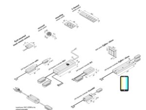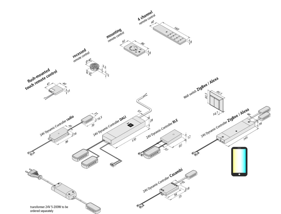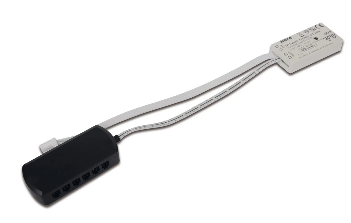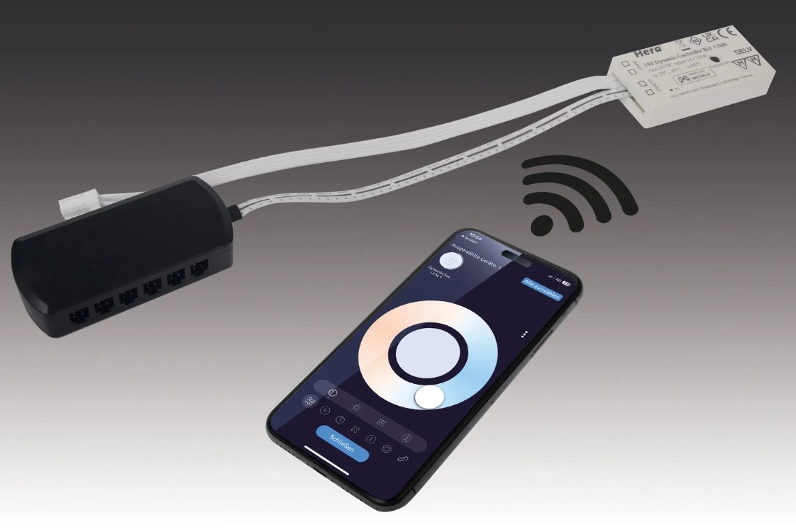 Bluetooth (Mesh) kontroller 24V mono või dünaamiliste valgustite lülitamiseks ja juhtimiseks, lihtne pistikühendus uute või olemasolevate paigaldiste jaoks, juhitav iga iOS-i või Androidi nutitelefoni või tahvelarvutiga (tasuta rakendus), mälufunktsiooniga (pärast vooluvõrgust väljalülitamist taastatakse viimane värvi- ja heleduse seadistus), toitekaabel kahe 24-pistikuga LED-valgusti ja 12-pesalise valgustite jaotajaga.