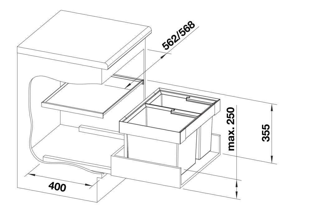 Paigalduskõrgus 355 mm, paigaldussügavus 400 mm, sahtlisiinide tõttu on vajalik sisemine kapi sügavus 450 mm.