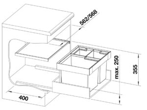 Paigalduskõrgus 355 mm, paigaldussügavus 400 mm, sahtlisiinide tõttu on vajalik sisemine kapi sügavus 450 mm.