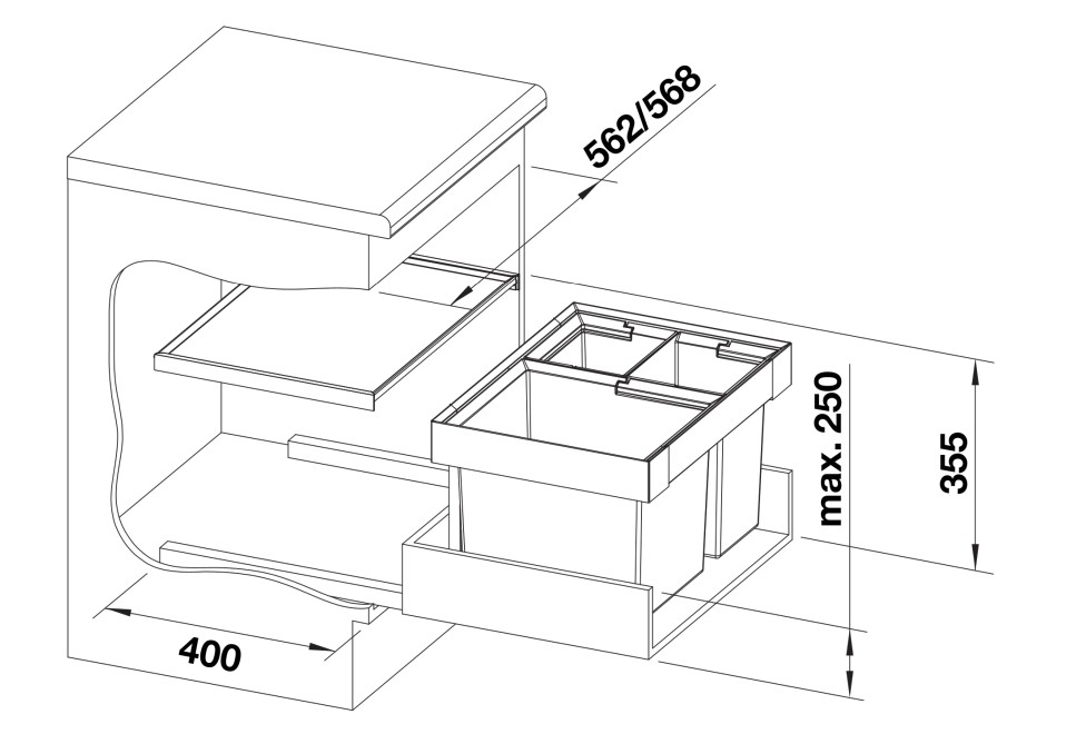 Prügisüsteem BLANCO Flexon II XL 60/3 600mm kapi sahtlisse, 3 ämbriga 1×30+2x8L