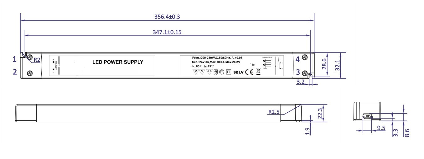 Toiteplokk SLIM 24V/10A 240W, ilma kaabliteta, plastik/valge 356.4×32.1×22.3mm
