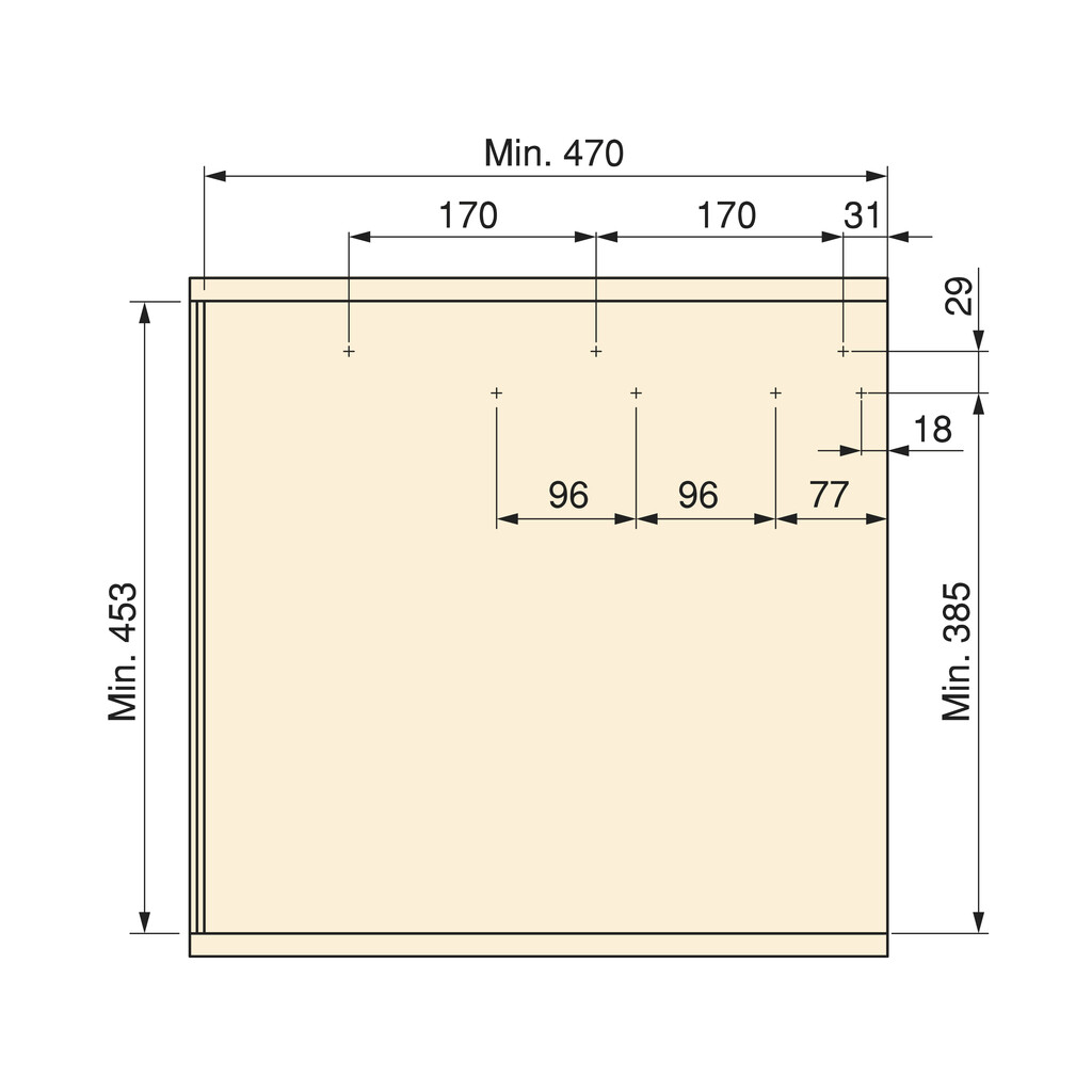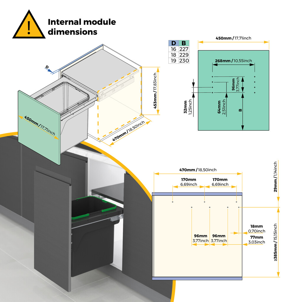 Sobib paigaldamiseks 45 cm moodulitesse, mille minimaalne sisemõõt on 470 mm sügavust ja 453 mm kõrgust. Ühildub 16, 18 ja 19 mm paksuste kapiplaatidega.