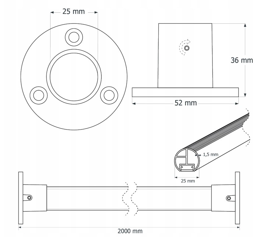 Komplektis: 1 LED riidepuutoru, 2 ümmargust pikendatud külgkandurit, kinnituskruvid