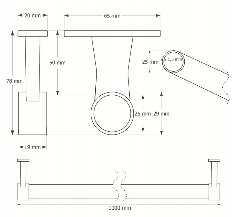 Ümar riidepuutoru SMART Ø25mm, L1000mm, 2 otsakandurit (kraeta), teras/matt vask