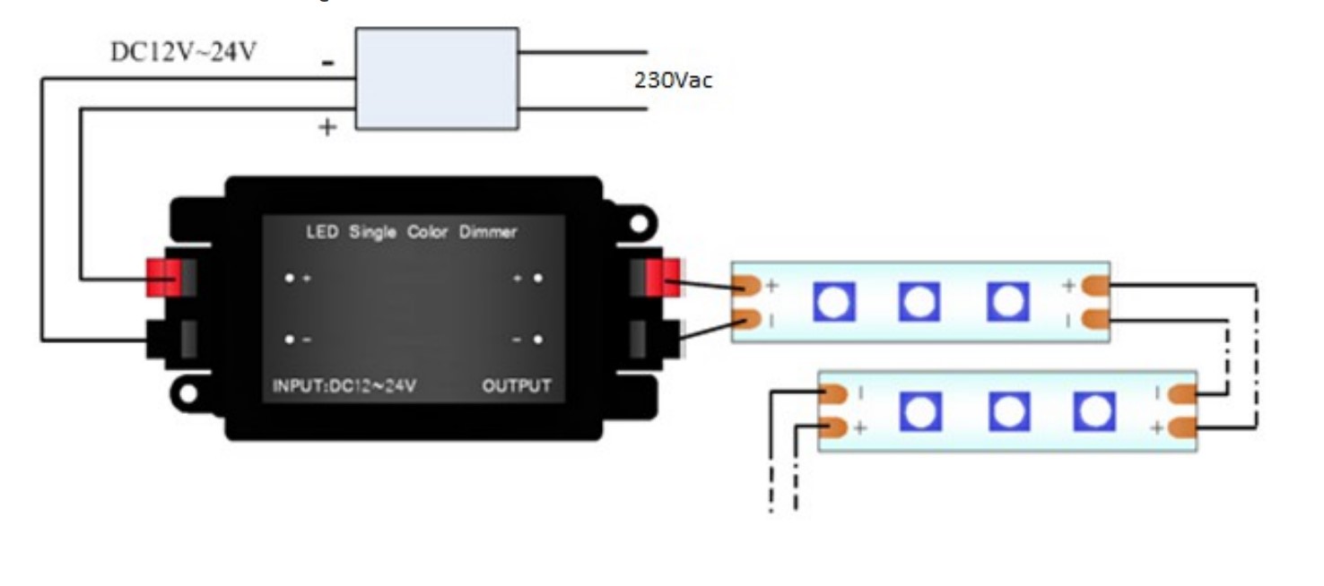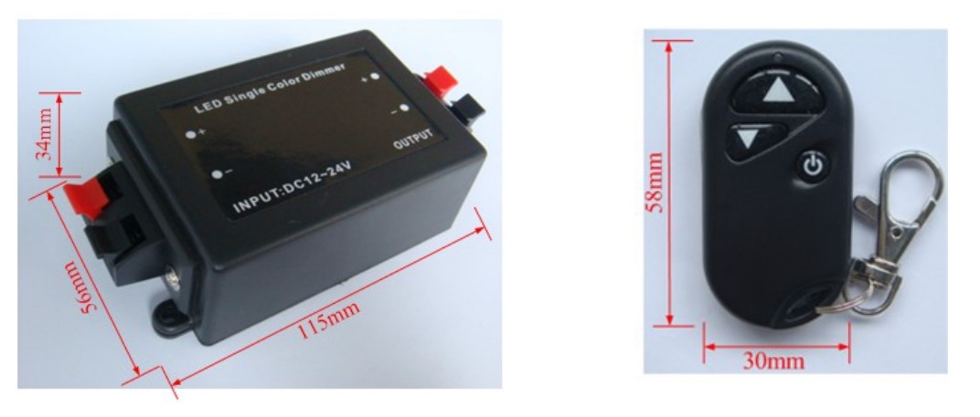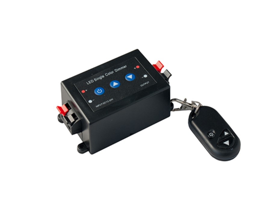 Juhtmevaba RF-kaugjuhtimispuldiga LED-dimmer sobib ideaalselt ühevärviliste LED-valgusribadega kasutamiseks. Kaugjuhtimispuldil on nooleklahvid, et hämardada valgusribasid vahemikus 0–100%, kasutades impulsslaiuse modulatsiooni (PWM). Toitetsükli režiimi säilitamine võimaldab valgusribal naasta režiimi, mis valiti enne väljalülitamist. Dimmeri maksimaalne võimsus on 8 amprit ja see ühildub LED-valgusribadega, mis töötavad 12-24V alalisvoolu vahemikus. Dimmeri (vastuvõtja) vedruklemmide pesad võimaldavad toite sisse ja välja ühendada ning on polaarsustundlikud (punane on positiivne ja must on negatiivne).
