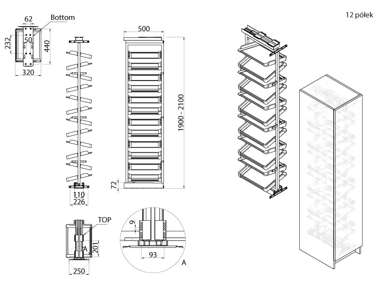 Väljatõmmatav jalatsiriiul SYMPHONY, H1900-2100mm, S542mm 12 riiuliga, teras/antratsiit